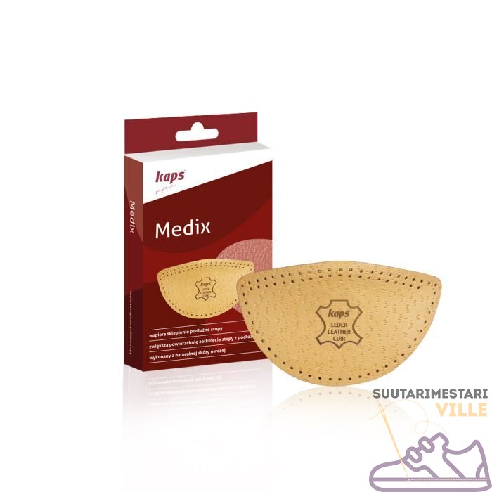 Medix nahkaa sekä tukimuovia oleva kiila, joka tukee jalkojen pituussuuntaista kaarta. kiinnitettäväksi kenkien sisäpuolelle.