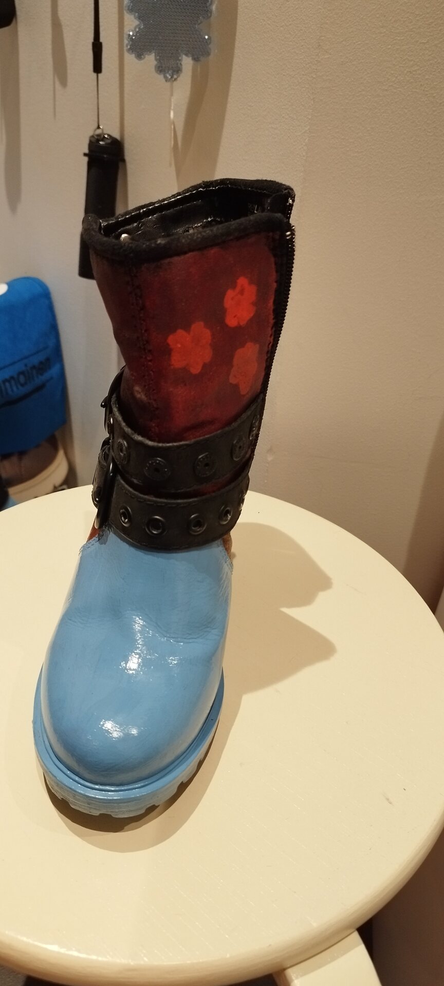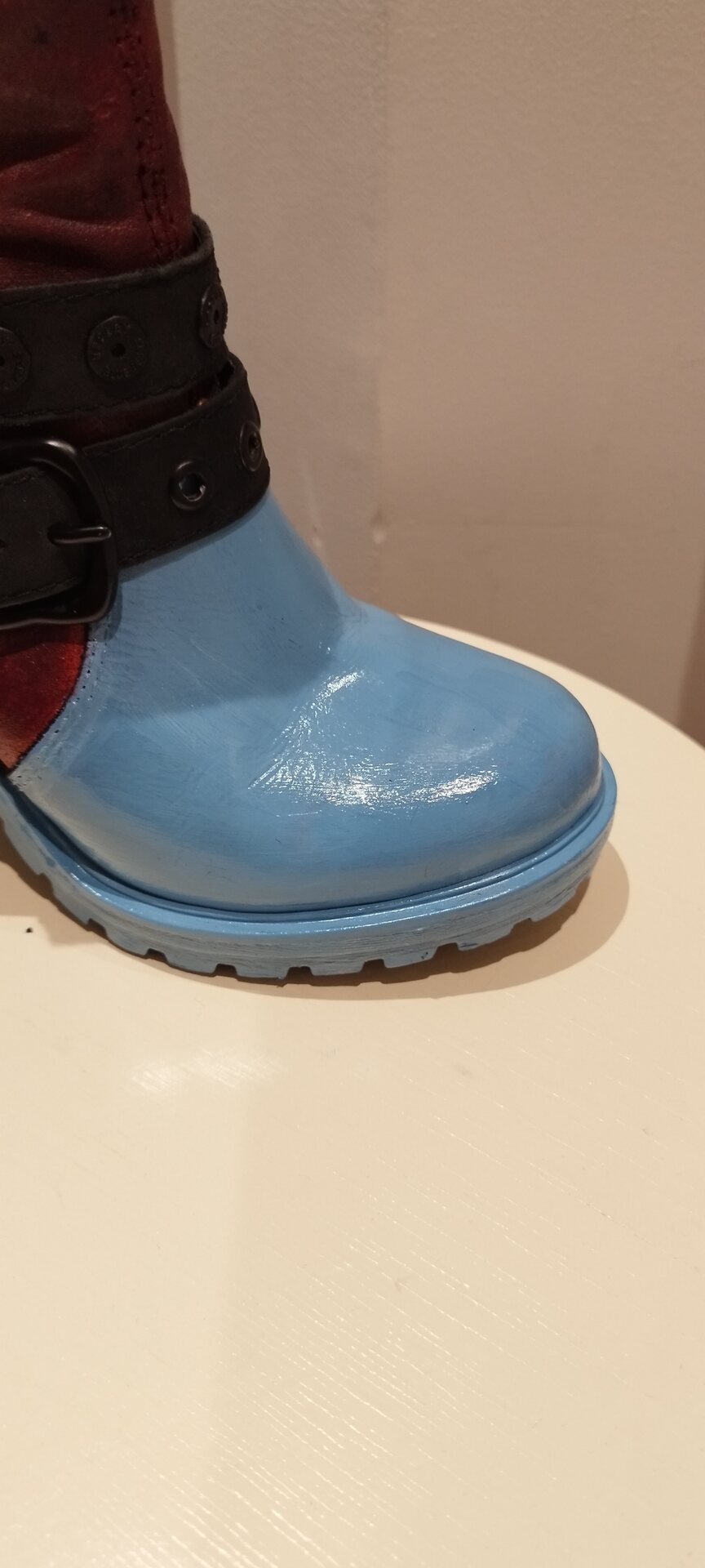Todella käunis, peittävä ja kiiltävä väri, kengät olivat alunperin mustat. Kaksi kertaa maalasin. Kenkien yläosa on mokkanahkaa, samoilla maaleilla maalasin ja hienoa jälkeä tuli. Pohjalle oranssia, päälle bordeux- punaista tuputtelin vaahtomuovilla.