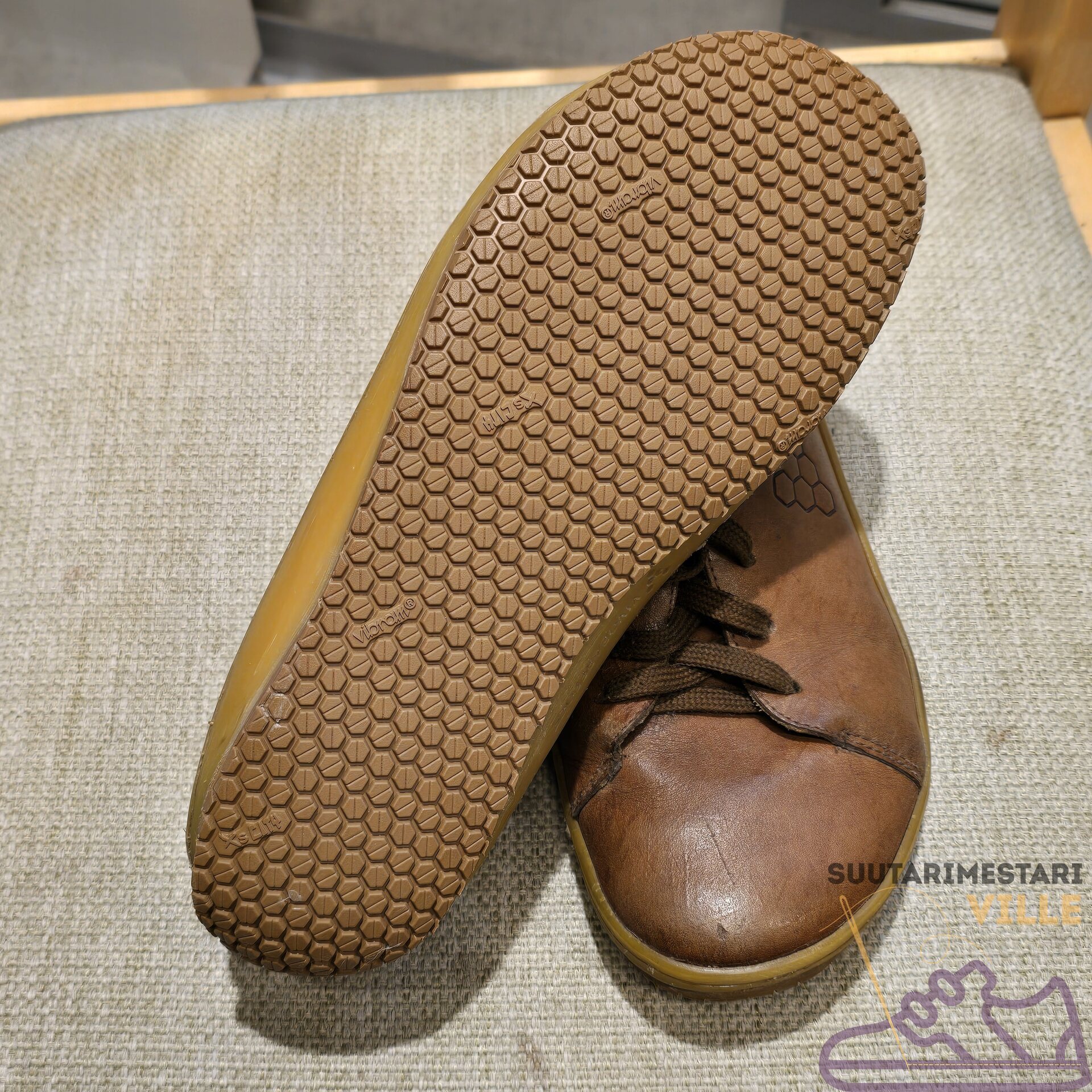 Paljasjalkakenkien pohjaus voidaan tehdä myös pitävällä talvikuvioidulla kumilla tai kevyemmällä kesäkumilla.