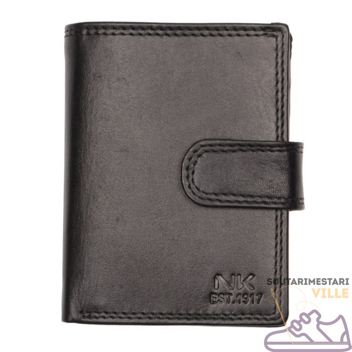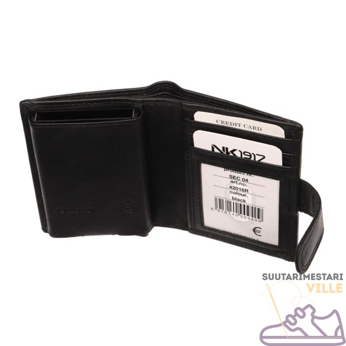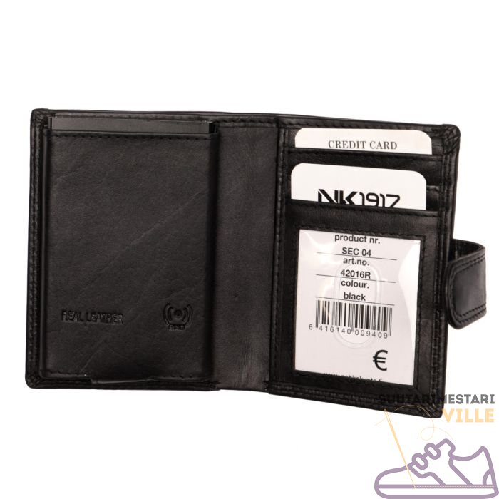 Lisäksi normaalit nahkaiset kolme luottokorttipaikkaa, joista yhdessä muovi-ikkuna esim. ajokorttia varten. Kaksiosainen setelipuoli ja takapinnassa kolikko-osasto.